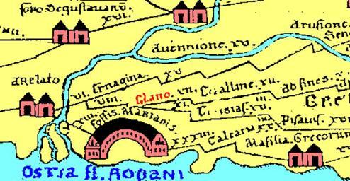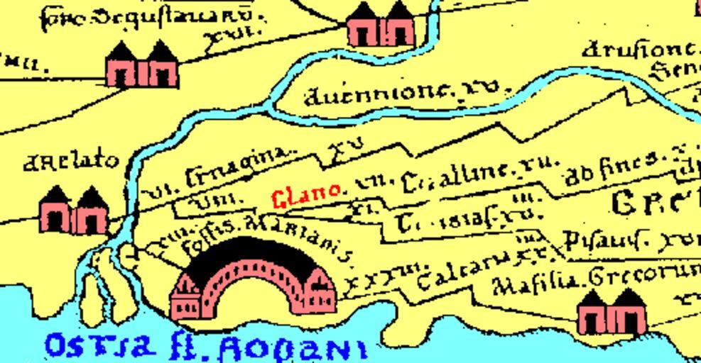 | Keywords: PeutingerGlanum.PNG A part of the en Peutinger Table showing Southern en France and the location of the Roman en city of en Glanum in red Scan of a en photocopy processed and re-coloured by en User Cwoyte Colours are nowhere near authentic and have only been added for clarity's sake <br> Apart from Glanum the following cities are shown Avennione Avennio en Avignon Arelato Arelatum en Arles Foſſis Marianis Fossae Marianae en Fos-sur-Mer and Maſilia Graecorum Massilia en Marseille The two en rivers shown are River Rhône flowing North to South the blue legend ostia fluvii Rhodani meaning mouths of the River Rhône and en Durance East-West The names of all locations are given in the en ablative case because they denote the distance from a given city; a kink in the road line indicates the actual location en wikipedia Common Good CommonsHelper 2004-07-28 Cwoyte wikipedia en PD-old original upload log page en wikipedia PeutingerGlanum PNG 2004-07-28 10 53 Cwoyte 507×263× 17879 bytes <nowiki>Part of the Peutinger Table showing Southern France and the location of the Roman city of Glanum in red Scan of an anonymous photocopy of a public domain work processed and coloured by CWoyte PD </nowiki> Glanum Tabula Peutingeriana Old maps of Provence-Alpes-Côte d'Azur |
