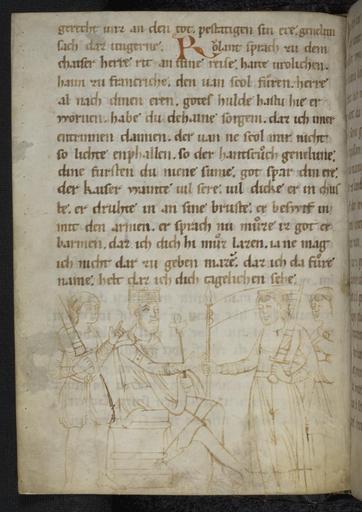 | Keywords: Pfaffe Konrad - Rolandslied - cod. pal. germ. 112 - 088.jpg Pfaffe Konrad - Rolandslied - cod pal germ 112 - jpg 087 089 Kaiser Karl der Große belehnt Roland mit den spanischen Gebieten Rolandslied des Pfaffen Konrad à bersetzung bzw Bearbeitung der altfranzösischen Chanson de Roland um 1100 Blatt 43v Pfaffe Konrad Rolandslied Pergament 123 Blatt 21x15 cm Regensburg/Hessen-Thüringen Ende 12 Jahrhundert Cod pal germ 112 Universitätsbibliothek Heidelberg http //diglit ub uni-heidelberg de/diglit/cpg112 century 12 Pfaffe Konrad PD-old Rolandslied Cod Pal germ 112 |