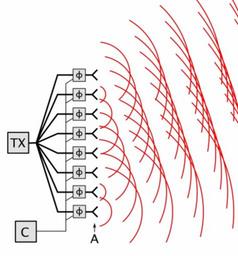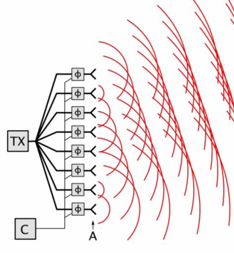 | Keywords: Phased array animation 10 frames 371x400px 100ms.gif  phased array antenna works A phased array is a computer-controlled antenna which produces a beam of radio waves that can be steered electronically to point in different directions without turning the antenna They are widely used in military radar The phased array consists of an array of multiple identical antenna elements A driven by a transmitter TX The feed current for each antenna passes through a device called a phase shifter φ which is controlled by a computer control system C The moving red lines show the wavefronts surfaces of constant phase of the radio waves emitted by each antenna The waves of the individual antennas are spherical but they combine superpose in front of the antenna to make a plane wave a beam of radio waves traveling in a specific direction By progressively delaying the phase of each antenna going up the line the phase shifters cause the beam of radio waves to be emitted at an angle to the plane of the antennas By changing the phase shifts the computer control system can instantly steer the beam to any direction over a wide angle in front of the antenna Th velocity of the radio waves is shown slowed down enormously 2016-12-06 own Chetvorno other versions cc-zero Phased array diagrams Array antennas Animated GIF files |