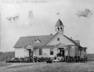 | Keywords: blackandwhite monochrome building architecture outdoor black and white Falling Creek Academy (aka Falling Creek School), Wayne County, NC; dated 1902-1904. Students and teachers pose in a group in front of a large frame school house with a bell cupola on the roof. A sign on the building states: “Built by Henry Johnson, Contractor and Builder, Goldsboro, N.C.” There is no ID label. Handwritten on the back of the mounting card is “Falling Creek Academy, Wayne County, (consolidated).” “The Hage Studio/A.O. Clement, Manager/Goldsboro, N.C.” is stamped on the back of the mounting card. Falling Creek High School was the first public school in Wayne County, established in 1840 in the Grantham community between Beaverdam Creek and the Neuse River. Falling Creek joins Beaverdam Creek in western Wayne County. John E. Hage was a photographer active in Goldsboro in partnership with Albert O. Clement, 1904-1905. Clement operated his own studio in Goldsboro 1905-1936. From the Wayne County Schools Photo Collection, PhC.209, State Archives of North Carolina, Raleigh, NC. Falling Creek Academy (aka Falling Creek School), Wayne County, NC; dated 1902-1904. Students and teachers pose in a group in front of a large frame school house with a bell cupola on the roof. A sign on the building states: “Built by Henry Johnson, Contractor and Builder, Goldsboro, N.C.” There is no ID label. Handwritten on the back of the mounting card is “Falling Creek Academy, Wayne County, (consolidated).” “The Hage Studio/A.O. Clement, Manager/Goldsboro, N.C.” is stamped on the back of the mounting card. Falling Creek High School was the first public school in Wayne County, established in 1840 in the Grantham community between Beaverdam Creek and the Neuse River. Falling Creek joins Beaverdam Creek in western Wayne County. John E. Hage was a photographer active in Goldsboro in partnership with Albert O. Clement, 1904-1905. Clement operated his own studio in Goldsboro 1905-1936. From the Wayne County Schools Photo Collection, PhC.209, State Archives of North Carolina, Raleigh, NC. |