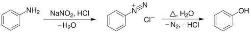 Keywords: PhenolSynthesisFromAniline.svg en synthesis of phenol from aniline 1 diazotisation of phenol 2 hydrolysis of the diazonium salt own Choij 2009-08-16 Phenol Diazonium salts