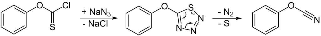 | Keywords: Phenylcyanate-synthesis-thermolysis.svg en Synthesis of phenylcyanate by thermolysis of 5-phenoxy-1 2 3 4-thiatriazole made of O-phenyl carbonochloridothioate and sodium azide First published by D Martin 1964 own Wampenseppl 2011-08-31 created with Inkscape validSVG Cc-zero Thermolysis |