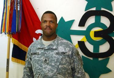 | Keywords: Philly Police Officer, Soldier Trying to Win Iraqi Hearts, Minds DVIDS31559.jpg en Sgt 1st Class Gerald Williams native of Philadelphia civil affairs Company B 404th Civil Affairs Battalion from Fort Dix N J attached to 3rd Heavy Brigade Combat Team 4th Infantry Division Task Force Lightning stands in front of the Striker Brigade symbol and colors at Forward Operating Base Warhorse near Baqubah Iraq 2006-10-05 Spc Paul Harris https //www dvidshub net/image/31559 31559 2006-10-11 10 36 BAQUBAH IQ PD-USGov Forward Operating Base Warhorse Images from DoD uploaded by Fæ |