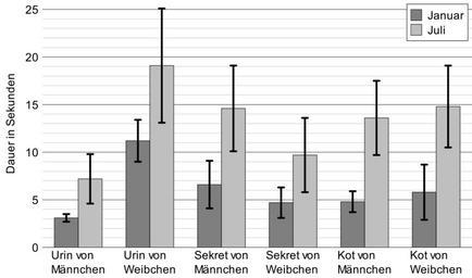 | Keywords: Phodopus roborovskii DE Markierverhalten.svg Durchschnittliche Dauer in Sekunden die männliche Roborowski-Zwerghamster am Urin am Sekret der Bauchdrüse und am Kot männlicher und weiblicher Artgenossen schnuppern; mit Standardfehlern EN mean number of seconds spent sniffing by Phodopus roborovskii males exposed to urine mid-ventral gland secretion and feces from conspecific males and females; with standard errors selbst erstellt mit Gnumeric 1 7 EN own work / nach Natalja Jurjewna Feoktistowa Ilja Grigorjewitsch Meschtscherski Behavioral Responses of Dwarf Hamsters Phodopus roborovskii and Phodopus sungorus to Same-Sex and Opposite-Sex Odors in Different Seasons In Robert E Johnston Dietland Müller-Schwarze Peter W Sorensen Hrsg Advances in Chemical Signals in Vertebrates Kluwer Academic/Plenum Publishers 1999 ISBN 0-306-46114-5 S 431 “436 Englisch; Tab 2 3 2008-03-12 Torben Schink wikitable style text-align center; - rowspan 2 Datum 2 durchschn Tageslänge 3 Lufttemperatur 2 Urin 2 Sekret 2 Kot - niedrigste durchschn höchste Männchen Weibchen Männchen Weibchen Männchen Weibchen - 24 “31 Januar 8 h 15 min ˆ’9 0 °C ˆ’2 8 °C 0 0 °C 3 1 ±0 4 11 2 ±2 2 6 6 ±2 5 4 7 ±1 6 4 8 ±1 1 5 8 ±2 9 - 12 “20 Juli 16 h 50 min +6 0 °C +16 8 °C +30 0 °C 7 2 ±2 6 19 1 ±6 0 14 6 ±4 5 9 7 ±3 9 13 6 ±3 9 14 8 ±4 3 Die Angaben beziehen sich auf neun unter halbnatürlichen Bedingungen gehaltene männliche Roborowski-Zwerghamster Phodopus roborovskii |