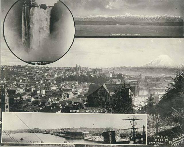 | Keywords: Photo collage of views of Washington, ca 1891 (LAROCHE 189).jpeg Photograph Creator Frank La Roche Photos entitled Snoqualmie Falls 286 ft; Olympic Mts from Seattle; Seattle from Hotel Denny; Seattle; Mt Rainier 14444 ft Subjects LCTGM Washington State --Collages; Waterfalls--Washington State ; Cities towns--Washington State ; Ships--Washington State --Seattle; Waterfronts--Washington State --Seattle; Mountains--Washington State Subjects LCSH Snoqualmie River Wash ; Seattle Wash ; Rainier Mount Wash ; Olympic Mountains Wash depicted place Washington D C ca 1891 Institution University of Washington UWASH-LAROCHE-source accession number laroche 189 PD-old-auto-1923 1936 Information field Order Number LAR244 Montages of the United States Olympic Mountains Snoqualmie Falls Old Seattle skylines Downtown Seattle Washington Paddle steamers of the United States Central Waterfront Seattle Washington Views of Mount Rainier from Seattle Washington state in the 1890s |