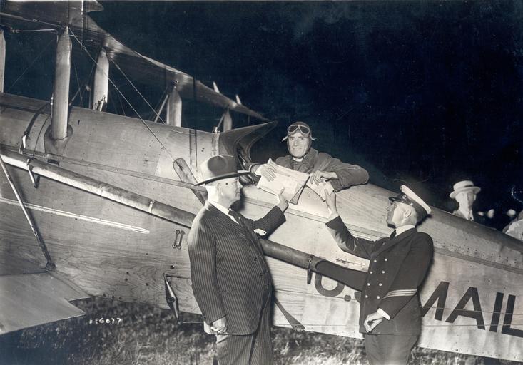 <b>Description</b>: US Postmaster General Harry S. New posed with airmail pilot James D. Hill and an unidentified military officer for the start of regularly scheduled transcontinental night and day airmail flights. New is shown presenting Hill with a ceremonial bundle of mail that was added to the cargo. As Hill prepared to take off from Hadley Field, New Jersey, hundreds of cars lined the field with their headlines on, adding their lights to those of the field for his take off shortly before 9 pm. National Postal Museum, Curatorial Photographic Collection Photographer: Unknown
