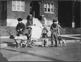 | Keywords: Photograph of Gerald R. Ford, Jr., Carl Engel, Tom Ford, and an Unidentified Boy with Their Pioneer Wagon After... - NARA - 186931.tif Scope and content This photograph depicts Gerald Ford wearing a hat and holding a pistol while holding the reins of a dog harnessed to a cart Another boy is sitting in the cart and two other boys are standing behind the cart all dressed in western clothing one is wearing woolly chaps A brick building is visible in the background This photograph was taken prior to the boys' participation in a neighborhood parade General notes 186931 Local identifier GRF-WHPO-H0023 04 President 1974-1977 Ford White House Photographic Office 1974 - 1977 Gerald R Ford Presidential Library http //www fordlibrarymuseum gov/avproj/hseries/1920 asp H0023-4 Institution Gerald R Ford Presidential Library Gerald R Ford Library NLGRF 1000 Beal Avenue Ann Arbor MI 48109-2114 1923 Record group Collection GRF-WHPO White House Photographic Office Collection Ford Administration 12/06/1973 - 01/20/1977 Record group ARC 1136 Gerald and Betty Ford Historical Photographs compiled 08/09/1974 - 01/20/1977 documenting the period 1884 - 1974 Series ARC 186757 File unit File unit ARC Variant control numbers NAIL Control Number NLF-WHPO-A-H0023 04 yes Other versions Gerald R Ford Presidential Library and Museum-cooperation PD-USGov Gerald Ford before 1974 Parades in the United States Gerald R Ford Presidential Library and Museum series Gerald and Betty Ford Historical Photographs compiled 08/09/1974 - 01/20/1977 documenting the period 1884 - 1974 |