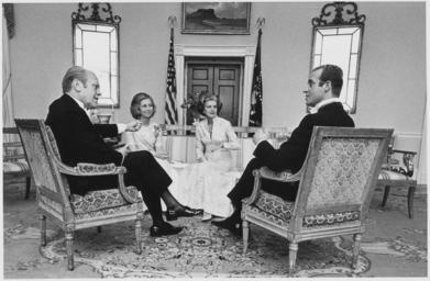 | Keywords: Photograph of President Gerald Ford, First Lady Betty Ford, King Juan Carlos I, and Queen Sophia Chatting in the... - NARA - 186832.tif en This photograph depicts President Gerald Ford and King Juan Carlos I with their backs partially towards camera and First Lady Betty Ford and Queen Sophia facing the camera in the Second Floor Yellow Oval Room This photograph was taken prior to going downstairs to greet guests attending the State Dinner held in honor of the Spanish monarchs Gerald Ford la reina de España Sofía la primera dama Betty Ford y el rey de España Juan Carlos durante una visita oficial de los monarcas españoles en la sala oval amarilla de la segunda planta de la Casa Blanca el 20 de junio de 1976 Posteriormente anfitriones e invitados bajaron para celebrar una cena de Estado en honor de los monarcas españoles General notes 186832 Local identifier GRF-WHPO-B0071 17A President 1974-1977 Ford White House Photographic Office 1974 - 1977 Thomas Ricardo White House photographer Photographer 8464655 <br /> Institution Gerald R Ford Presidential Library Gerald R Ford Library NLGRF 1000 Beal Avenue Ann Arbor MI 48109-2114 1976-06-20 Record group Collection GRF-WHPO White House Photographic Office Collection Ford Administration 12/06/1973 - 01/20/1977 Record group ARC 1136 Gerald R Ford White House Photographs compiled 08/09/1974 - 01/20/1977 Series ARC 1756311 File unit File unit ARC Variant control numbers NAIL Control Number NLF-WHPO-A-B0071 17A yes Other versions Gerald R Ford Presidential Library and Museum-cooperation PD-USGov Spain during Cold War People in 1976 Betty and Gerald Ford Juan Carlos I of Spain with national leaders Juan Carlos I of Spain in 1976 Queen Sofía of Spain Yellow Oval Room White House in 1976 People in conversation Gerald R Ford Presidential Library and Museum series Gerald R Ford White House Photographs compiled 08/09/1974 - 01/20/1977 |