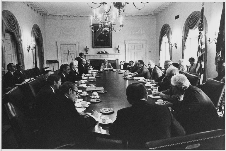 | Keywords: Photograph of President Gerald R. Ford Participating in a Meeting with His Cabinet - NARA - 186766.tif The photograph depicts a meeting of President Gerald R Ford with his cabinet in the Cabinet Room at the White House Clockwise from President Ford seated around the table are James R Schlesinger Secretary of Defense Frederick B Dent Secretary of Commerce Claude S Brinegar Secretary of Transportation Kenneth Rush Counsellor to the President Caspar W Weinberger Secretary of Health Education and Welfare Dean Burch Counsellor to the President James T Lynn Secretary of Housing and Urban Development Earl L Butz Secretary of Agriculture William T Simon Secretary of the Treasury William B Saxbe Attorney General Peter J Brennan Secretary of Labor Roy L Ash Director of the Office of Management and Budget John O Marsh Counsellor to the President Robert T Hartmann Counsellor to the President unidentified Rogers C B Morton Secretary of the Interior Henry A Kissinger Secretary of State In the left rear of the photograph are Brent Scowcroft Deputy Assistant for National Security Affairs Alan Greenspan Chairman of the Council of Economic Advisers and William E Timmons Assistant General notes 186766 Local identifier GRF-WHPO-A0360 27 President 1974-1977 Ford White House Photographic Office 1974 - 1977 Kennerly David Hume 1947- Photographer 1312484 <br /> Institution Gerald R Ford Presidential Library Gerald R Ford Library NLGRF 1000 Beal Avenue Ann Arbor MI 48109-2114 1974-08-26 Record group Collection GRF-WHPO White House Photographic Office Collection Ford Administration 12/06/1973 - 01/20/1977 Record group ARC 1136 Gerald R Ford White House Photographs compiled 08/09/1974 - 01/20/1977 Series ARC 1756311 File unit File unit ARC Variant control numbers NAIL Control Number NLF-WHPO-A-A0360 27 yes Other versions Gerald R Ford Presidential Library and Museum-cooperation PD-USGov Gerald Ford in 1974 Cabinet Room Henry Kissinger William E Simon James R Schlesinger William B Saxbe Rogers Morton Earl Butz Frederick B Dent Peter J Brennan Caspar Weinberger James Thomas Lynn Claude Brinegar Gerald R Ford Presidential Library and Museum series Gerald R Ford White House Photographs compiled 08/09/1974 - 01/20/1977 |