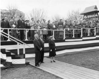 | Keywords: nara:arcid=6233771 u.s. national archives usnationalarchives harry s. truman library harrystrumanlibrary military band militaryband harry s. truman harrystruman bess truman besstruman standing at attention standingatattention 1952 1950's 1950s ceremony monochrome blackandwhite outdoor black and white Original Caption: Photograph of President Harry S. Truman at Carillon Ceremony, 04/04/1952 Created By: National Archives and Records Administration. Office of Presidential Libraries. Harry S. Truman Library. (04/01/1985 - ) From: Series: Photographs Relating to the Administration, Family, and Personal Life of Harry S. Truman, compiled 1957 - 2004, documenting the period 1849 - 2004 Contact: Harry S. Truman Library (NLHST), 500 West U.S. Highway 24, Independence, MO, 64050-1798. PHONE: 816-268-8272; FAX: 816-268-8295; EMAIL:truman.reference@nara.gov. Production Dates: 04/04/1952 Scope and Content Note: President Harry S. Truman (left) with First Lady Bess W. Truman (right) at Meridian Hill Park, Washington, D.C. They are there for a ceremony in which Queen Juliana of the Netherlands presented a carillon to the people of the United States. Standing between them is Edward J. Kelly, Superintendent of National Capital Parks. All others unidentified. Persistent URL: arcweb.archives.gov/arc/action/ExternalIdSearch?id=6233771 Truman Library URL: www.trumanlibrary.org/photographs/view.php?id=40067&rr= Access Restrictions: Unrestricted Use Restrictions: Unrestricted Original Caption: Photograph of President Harry S. Truman at Carillon Ceremony, 04/04/1952 Created By: National Archives and Records Administration. Office of Presidential Libraries. Harry S. Truman Library. (04/01/1985 - ) From: Series: Photographs Relating to the Administration, Family, and Personal Life of Harry S. Truman, compiled 1957 - 2004, documenting the period 1849 - 2004 Contact: Harry S. Truman Library (NLHST), 500 West U.S. Highway 24, Independence, MO, 64050-1798. PHONE: 816-268-8272; FAX: 816-268-8295; EMAIL:truman.reference@nara.gov. Production Dates: 04/04/1952 Scope and Content Note: President Harry S. Truman (left) with First Lady Bess W. Truman (right) at Meridian Hill Park, Washington, D.C. They are there for a ceremony in which Queen Juliana of the Netherlands presented a carillon to the people of the United States. Standing between them is Edward J. Kelly, Superintendent of National Capital Parks. All others unidentified. Persistent URL: arcweb.archives.gov/arc/action/ExternalIdSearch?id=6233771 Truman Library URL: www.trumanlibrary.org/photographs/view.php?id=40067&rr= Access Restrictions: Unrestricted Use Restrictions: Unrestricted |