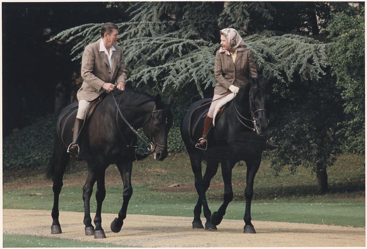 | Keywords: Photograph of President Reagan and Queen Elizabeth II Horseback Riding at Windsor Castle, England - NARA - 198530.jpg Scope and content General notes 198530 Local identifier President 1981-1989 Reagan White House Photographic Office 1981 - 1989 Ronald Reagan Library NLRR 40 Presidential Drive Simi Valley CA 93065-0600 date 1982 06 08 - 1982 06 08 Record group Collection RR-WHPO White House Photographic Collection 01/20/1981 - 01/20/1989 Record group ARC 1192 Reagan White House Photographs compiled 01/20/1981 - 01/20/1989 documenting the period 1915 - 01/20/1989 Series ARC 198505 File unit File unit ARC Variant control numbers NAIL Control Number NLS-WHPO-A-C8454 18 Other versions <gallery> File Photograph_of_President_Reagan_and_Queen_Elizabeth_II_Horseback_Riding_at_Windsor_Castle _England_-_NARA_-_198530 tif tif File Photograph_of_President_Reagan_and_Queen_Elizabeth_II_Horseback_Riding_at_Windsor_Castle _England_-_NARA_-_198530 jpg jpg </gallery> NARA-cooperation PD-USGov Ronald Reagan |