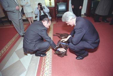| Keywords: u.s. national archives usnationalarchives william j. clinton presidential library williamjclintonpresidentiallibrary nara:arcid=6036947 bill clinton billclinton jacques chirac jacqueschirac france petting buddy indoor Title: Photograph of President William Jefferson Clinton and President Jacques Chirac of France Petting Buddy the Dog: 02/19/1999 Creator: President (1993-2001 : Clinton). White House Photograph Office. (01/20/1993 - 01/20/2001) Types of Archival Materials: Photographs and other Graphic Materials Contacts: William J. Clinton Library (NLWJC), 1200 President Clinton Avenue, Little Rock, AR 72201. Phone: 501-244-2877; Fax: 501-244-2881; Email: clinton.library@nara.gov Production Dates: 02/19/1999 From: Series: Photographs Relating to the Clinton Administration, compiled 01/20/1993 - 01/20/2001 Collection WJC-WHPO: Photographs of the White House Photograph Office (Clinton Administration), 01/20/1993 - 01/20/2001 Persistent URL: arcweb.archives.gov/arc/action/ExternalIdSearch?id=6036947 Access Restriction(s): Unrestricted Use Restriction(s): Unrestricted Title: Photograph of President William Jefferson Clinton and President Jacques Chirac of France Petting Buddy the Dog: 02/19/1999 Creator: President (1993-2001 : Clinton). White House Photograph Office. (01/20/1993 - 01/20/2001) Types of Archival Materials: Photographs and other Graphic Materials Contacts: William J. Clinton Library (NLWJC), 1200 President Clinton Avenue, Little Rock, AR 72201. Phone: 501-244-2877; Fax: 501-244-2881; Email: clinton.library@nara.gov Production Dates: 02/19/1999 From: Series: Photographs Relating to the Clinton Administration, compiled 01/20/1993 - 01/20/2001 Collection WJC-WHPO: Photographs of the White House Photograph Office (Clinton Administration), 01/20/1993 - 01/20/2001 Persistent URL: arcweb.archives.gov/arc/action/ExternalIdSearch?id=6036947 Access Restriction(s): Unrestricted Use Restriction(s): Unrestricted |