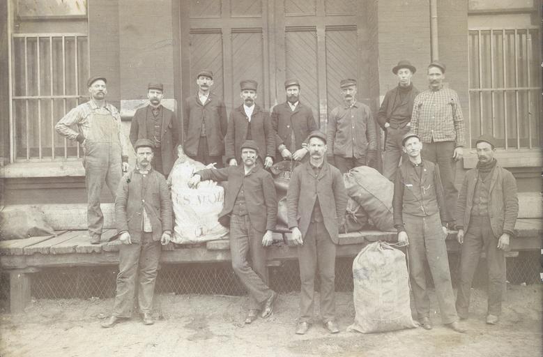 Keywords: smithsonian institution smithsonianinstitution men moustache mustache hat standing outdoors working work workers mail postal thirteen kansas city kansascity sepia old west oldwest railroad conductors heritage national postal museum nationalpostalmuseum Date: c. 1910 Object number: A.2009-40 Medium: paper; photo-emulsion Description: A group of thirteen unidentified postal employees pose with mail sacks at a back entrance to the old Kansas City, Missouri, post office. Most of the clerks were part of the Post Office Department's Railway Mail Service (RMS). Unlike Railway Post Office (RPO) clerks who sorted mail on board moving trains, these RMS clerks worked to move and process mail going onto or coming off of RPO cars. National Postal Museum, Curatorial Photographic Collection Photographer: Unknown Place: United States of America      Missouri See more items in: National Postal Museum Collection Credit line: National Postal Museum, Curatorial Photographic Collection Photographer: Unknown Persistent URL:http://www.arago.si.edu/index.asp?con=2&cmd=1&id=207604 Repository:National Postal Museum View more collections from the Smithsonian Institution. Date: c. 1910 Object number: A.2009-40 Medium: paper; photo-emulsion Description: A group of thirteen unidentified postal employees pose with mail sacks at a back entrance to the old Kansas City, Missouri, post office. Most of the clerks were part of the Post Office Department's Railway Mail Service (RMS). Unlike Railway Post Office (RPO) clerks who sorted mail on board moving trains, these RMS clerks worked to move and process mail going onto or coming off of RPO cars. National Postal Museum, Curatorial Photographic Collection Photographer: Unknown Place: United States of America Missouri See more items in: National Postal Museum Collection Credit line: National Postal Museum, Curatorial Photographic Collection Photographer: Unknown Persistent URL:http://www.arago.si.edu/index.asp?con=2&cmd=1&id=207604 Repository:National Postal Museum View more collections from the Smithsonian Institution. |