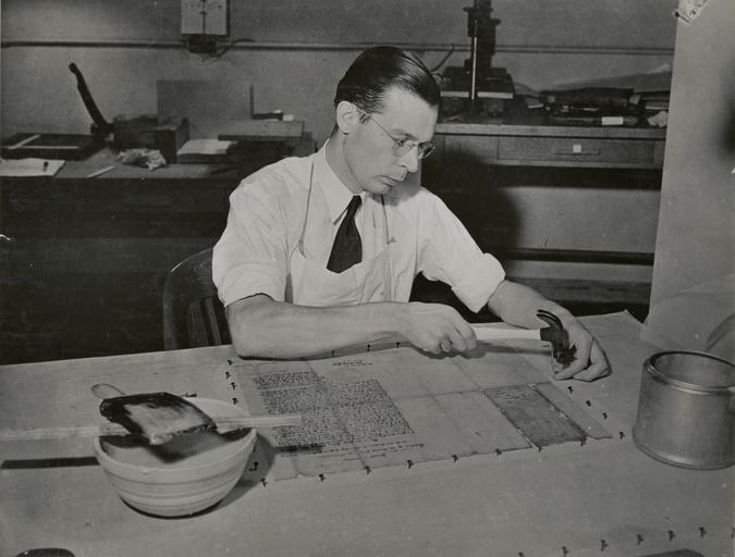Keywords: united states national archives personnel unitedstatesnationalarchivespersonnel nara:arcid=3493246 repair preservation u.s. national archives usnationalarchives b/w bw monochrome Original Caption: Rehabilitation of records in Repair and Preservation Division, August 12, 1942. U.S. National Archives’ Local Identifier: 64-NA-334 Persistent URL: catalog.archives.gov/id/3493246 Repository: Still Picture Records Section, Special Media Archives Services Division (NWCS-S), National Archives at College Park, 8601 Adelphi Road, College Park, MD, 20740-6001. For information about ordering reproductions of photographs held by the Still Picture Unit, visit: www.archives.gov/research/order/still-pictures.html Reproductions may be ordered via an independent vendor. NARA maintains a list of vendors at www.archives.gov/research/order/vendors-photos-maps-dc.html Access Restrictions: Unrestricted Use Restrictions: Unrestricted Original Caption: Rehabilitation of records in Repair and Preservation Division, August 12, 1942. U.S. National Archives’ Local Identifier: 64-NA-334 Persistent URL: catalog.archives.gov/id/3493246 Repository: Still Picture Records Section, Special Media Archives Services Division (NWCS-S), National Archives at College Park, 8601 Adelphi Road, College Park, MD, 20740-6001. For information about ordering reproductions of photographs held by the Still Picture Unit, visit: www.archives.gov/research/order/still-pictures.html Reproductions may be ordered via an independent vendor. NARA maintains a list of vendors at www.archives.gov/research/order/vendors-photos-maps-dc.html Access Restrictions: Unrestricted Use Restrictions: Unrestricted |