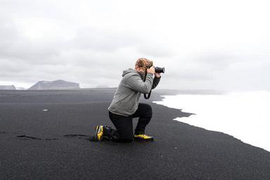 Keywords: photographer camera picture guy man people hat grey sand shore cloudy clouds