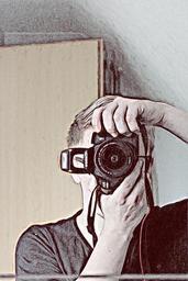 Keywords: photographer drawing photo camera pencil drawing lens flash light self portrait mirroring mirrored hands keep head man hair
