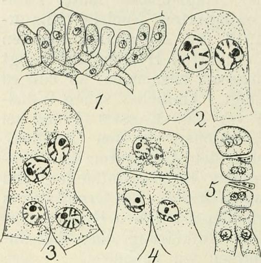Keywords: Phragmidium speciosum aecidiospore.jpg Fig 331 Phragmidium speciosum 1 junges Aecidienlager 2 Kopulationzwischen zwei Nachbarzellen einessolchen Lagers H auf die Kernfusionist doppelte Kernteilung gefolgt 4 der obere Teil von 3 wird zur Mutterzelle der Aecidiosporen 5 eine Reihe von drei 2 kernigen Aecidio-sporen die durch die Zwischenzellengetrennt sind; unten die beiden copulierenden Zellen Nach Christmanaus Engler-GilG https //www flickr com/photos/internetarchivebookimages/14773807925/in/photolist-xBsJnV-xtKjJM-xBVNcf-xT6F75-xBst36-xTXPfH-xA8Snf-wchf4B-xw87ho-wXyd73-wVJkWW-ovty59-ovvCoi-wWWJmW-wVSh8M-xC19Sp-xBTGpW-xRD1PA-xVaeb6-wFFvnf-xRD59w-w2gFry-w2h7b3-wWWysN-xBkWxG-x9Goj4-wX5Sux 1921 Tischler Georg Friedrich Leopold Basidiomycota Phragmidium PD-old