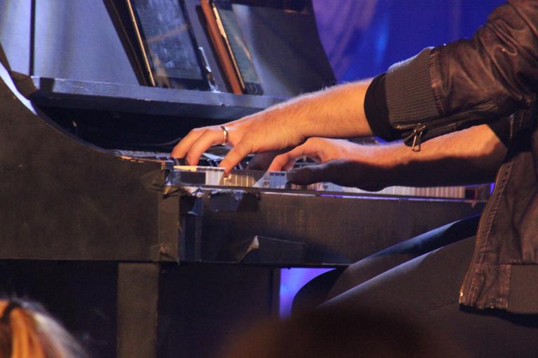 Keywords: piano player concert music instrument key musician musical black practicing performance caucasian note person playing keyboard rock hands leather jacket arms sleeves vintage modern