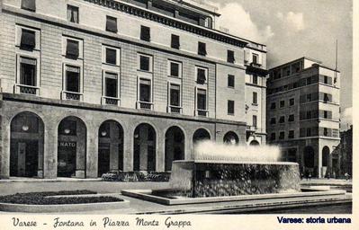 Keywords: Piazza Monte Grappa con la fontana. A destra il palazzo delle Generali non è ancora stato ultimato e si vedono le palizzate che impediscono l'accesso ai portici. varese piazzamontegrappa