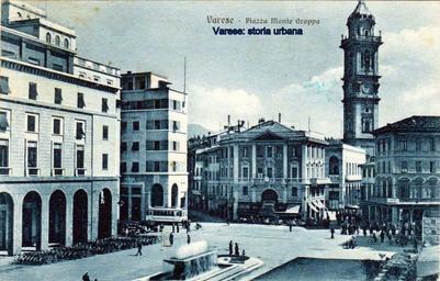 | Keywords: Piazza Monte Grappa. A destra in corso Roma (ora Moro) casa Romanò (ing. Paolo Cantù, 1889) non è ancora stata oscurata dal palazzo dell'INPS che è ancora in costruzione (si vede il cantiere all'estrema destra). Al centro palazzo Mascardi/Pini (ing. Camillo Lucchina, 1929) e a seguire il palazzo delle Generali. Tra le case svetta il campanile di S. Vittore (Giuseppe Bernascone, 1617-1774). tram varese piazzamontegrappa | ||||