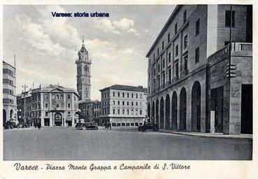 | Keywords: varese piazza monte grappa piazzamontegrappa outdoor road photo border building architecture skyline La "nuova" piazza Monte Grappa ancora priva della fontana. In primo piano sulla destra palazzo Castiglioni (ing. Mario Loreti). Sullo sfondo a destra in corso Roma (ora Moro) casa Romanò (ing. Paolo Cantù, 1889) non è ancora stata oscurata dal palazzo dell'INPS, a sinistra palazzo Mascardi/Pini (ing. Camillo Lucchina, 1929) e a seguire una parte del palazzo delle Generali. Tra le case svetta il campanile di S. Vittore (Giuseppe Bernascone, 1617-1774). La "nuova" piazza Monte Grappa ancora priva della fontana. In primo piano sulla destra palazzo Castiglioni (ing. Mario Loreti). Sullo sfondo a destra in corso Roma (ora Moro) casa Romanò (ing. Paolo Cantù, 1889) non è ancora stata oscurata dal palazzo dell'INPS, a sinistra palazzo Mascardi/Pini (ing. Camillo Lucchina, 1929) e a seguire una parte del palazzo delle Generali. Tra le case svetta il campanile di S. Vittore (Giuseppe Bernascone, 1617-1774). |