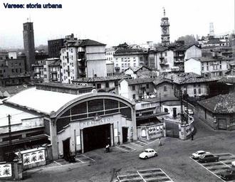 Keywords: Immagine di piazza Repubblica, in primo piano il mercato coperto (ing. Alberto Alliaud, 1931) demolito nel 1992. varese