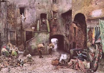 | Keywords: PiazzaDelleAzimelleInGhettoByRoeslerFranz.jpg Piazza delle Azimelle in Ghetto Rome rione Sant'Angelo Scanning of reproduction painting ~ 1880 Creator Ettore Roesler Franz Author died more than 70 years ago PD-old-100 Ettore Roesler Franz - Rione XI Sant'Angelo Ghetto Rome in art Destroyed Rome |