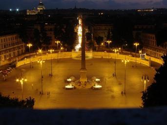 Keywords: PiazzaDelPopolonighttime.JPG en Piazza del Popolo at night with view of the Vatican in the background Steven Cogburn NoFear0710 2007-08-31 Piazza del Popolo Rome at night Exterior lighting in Italy Rome Piazza Popolo