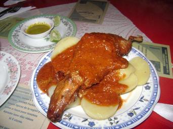 | Keywords: PicantedeCuy2.JPG Un plato de 'Picante de Cuy' servido en un resturant de la carretera que une la ciudad de Huaraz con la zona del nevado Pastoruri En la parte superior izquierda puede apreciarse un envase con salsa de ají uno de los usuales acompañamientos de este plato Own 2007-08-29 Dtarazona Cuy-based food in Peru |