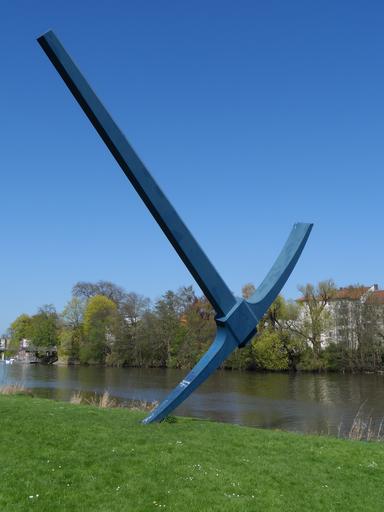 Keywords: pickaxe sculpture documenta kassel fulda shore river meadow plastic artwork subject landscape bank surprise oldenburg artists art object blue powerful huge large slaying