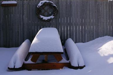 Keywords: picnic table snow winter fence seating outdoors snowy bench