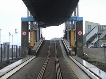 | Keywords: Picton Rail Ferry Ramp.jpg Train and truck/car loading ramp at Picton Ferry Terminal South Island New Zealand The three interlaced tracks align with the tracks on the ferry rail deck The upper ramp connects with the road deck for cars/trucks only The ramp at the Wellington North Island Terminal is similar Own Christopher bateman Gauntlet tracks Cook Strait Ferry terminals in New Zealand Rail transport infrastructure in New Zealand Picton New Zealand Speed limit signs in New Zealand Train ferries Loading ramps watercraft |