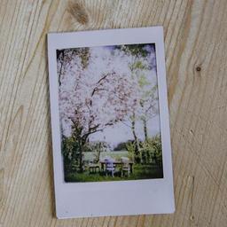 Keywords: picture instant polaroid vintage photograph nostalgia old-fashioned photo retro happy positive camera wood table frame tree blossoms joy leisure happiness positivity print landscape garden carefree freedom