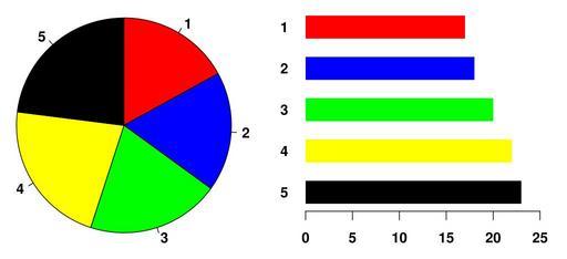 | Keywords: Piechart.svg Example of a pie chart along with a bar plot showing the same data and indicating that the pie chart is not the best possible chart for this particular dataset The graphic was created by User Schutz for Wikipedia on 27 December 2006 using the http //www r-project org/ R statistical project The program that generated the graphic is given below; the data and the idea are from w Image PieCompare png by w User Chrispounds The graph was exported in postscript format converted to SVG using the <tt>pstoedit</tt> command and the layout was slightly modified using Inkscape before upload v +pstoedit+Inkscape a <- c 13 14 30 43 cols <- c blue green yellow black postscript piechart eps paper special width 8 height 4 par mfrow c 1 2 par cex 1 2 par font 2 defaultmar <- par mar par mar c 0 0 0 0 Margins par las 1 Axis labels always horizontal par font axis 2 pie a init 90 clockwise T col cols par mar defaultmar-c 1 7 2 2 5 1 barplot rev a horiz T xlim c 0 25 col rev cols border 0 names arg 5 1 space 0 8 dev off Pie charts SVG pie charts |