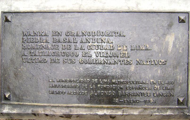 | Keywords: Piedra basal andina (placa).JPG es Placa de la Piedra basal andina Lima Perú own Dtarazona 2008-08 Text <div><center> Wanka en granodiorita <br> Piedra basal andina <br> Homenaje de la ciudad de Lima <br> A Taulichusco el viejo el<br> último de sus gobernantes nativos<br> La municipalidad de Lima Metropolitana en el 450<br> aniversario de la fundación española de Lima<br> siendo alcalde Alfonso Barrantes Lingán<br> 13- enero - 1985 </div></center> Plaques in Lima Pasaje Santa Rosa Lima Taulichusco Alfonso Barrantes |