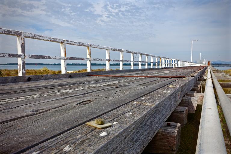 Keywords: pier wooden planks jetty wood bridge railing pipes