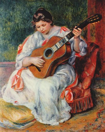 | Keywords: Pierre-Auguste Renoir 043.jpg Artwork Creator Pierre-Auguste Renoir de Gitarrespielerin oil on canvas cm 81 65 Institution Musée des Beaux-Arts de Lyon Lyon France Yorck ca 1896-1897 http //mail wikipedia org/pipermail/wikide-l/2005-April/012195 html Other versions 150px PD-old-auto 1919 PD-Art-YorckProject DEFAULTSORT 1896-1897; Pierre-Auguste Renoir 1890s oil on canvas paintings in France 19th-century oil portraits of sitting women at full length Arms in art French paintings in the Musée des Beaux-Arts de Lyon Guitarists in art Impressionist paintings in the Musée des Beaux-Arts de Lyon Impressionist paintings of musicians Paintings by Pierre-Auguste Renoir in France guitare Paintings of sitting women playing musical instruments indoors Paintings of women by Pierre-Auguste Renoir People in three-quarter views in art Temporary for Cat-a-lot - Female humans Eye “hand coordination |