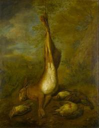 | Keywords: Pieter Andreas Rijsbrack - A dead hanging hare with a dead grey partridge, a woodcock and a thrush.jpg Artwork creator Pieter Andreas Rijsbrack en A dead hanging hare with a dead grey partridge a woodcock and a thrush 1st half of 18th century http //www bonhams com/auctions/15832/lot/130 Oil canvas cm 91 6 71 2 Sold by Bonhams on 29 October 2008 in London as lot 130 signed with initials 'PA ' on rock lower centre the P and the A in ligature Other versions PD-old-100 Still life paintings by Pieter Andreas Rijsbrack |