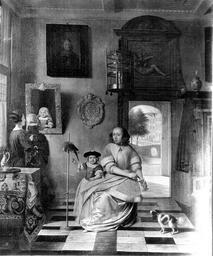 | Keywords: Pieter de Hooch - Interior with two women, two children and a parrot.jpg Artwork creator Pieter de Hooch Title Interior with two women two children and a parrot Interieur met twee vrouwen twee kinderen en een papegaai 1673 gedateerd 248136 ca 1673 oil canvas cm 76 67 unknown Private collection P C Sutton Pieter de Hooch Oxford 1980 cat no 102 ; C Hofstede de Groot Beschreibendes und Kritisches Verzeichnis der Werke der Hervorragendsten Hollandischen Maler des XVII Jahrhunderts vol I Paris 1907 cat no 114 object history private collection Adolphe Schloss Paris ; lost during WWII credit line https //rkd nl/explore/images/248136 Other versions PD-old-100 Genre paintings by Pieter de Hooch 1673 paintings |