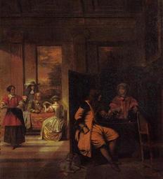 | Keywords: Pieter de Hooch - A man and a serving woman behind a screen, with card players beyond.jpg Artwork creator Pieter de Hooch Title A man and a serving woman behind a screen with card players beyond in a neoclassical interior Gezelschap in een rijk interieur zich vermakend met kaartspel roken en drinken ca 1670 41794 ca 1660 oil canvas cm 88 81 unknown Private collection P C Sutton Pieter de Hooch Oxford 1980 cat no 119 ; C Hofstede de Groot Beschreibendes und Kritisches Verzeichnis der Werke der Hervorragendsten Hollandischen Maler des XVII Jahrhunderts vol I Paris 1907 cat no 266 object history credit line http //www sothebys com/en/auctions/ecatalogue/2001/old-master-paintings-part-i-l01121/lot 53 html Other versions http //www artnet com/artists/pieter-de-hooch/a-man-and-a-serving-woman-behind-a-screen-with-dAR4yorv_XbveEDVKlgGUw2 PD-old-100 Genre paintings by Pieter de Hooch 1660 paintings |
