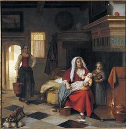 | Keywords: Pieter de Hooch - A mother with two children and a maid in a kitchen with dogs and a cat by a fireplace.jpg Artwork creator Pieter de Hooch Title A mother with two children and a maid with a pail by a fireplace Huiselijke scene met een vrouw met kinderen bij de haard late jaren zeventig 61144 ca 1675 “1680 oil canvas cm 83 8 81 6 unknown Private collection P C Sutton Pieter de Hooch Oxford 1980 cat no 125 ; C Hofstede de Groot Beschreibendes und Kritisches Verzeichnis der Werke der Hervorragendsten Hollandischen Maler des XVII Jahrhunderts vol I Paris 1907 cat no 42 object history credit line http //www sothebys com/en/auctions/ecatalogue/2006/the-dealers-eye-n08163/lot 120 html Other versions PD-old-100 Genre paintings by Pieter de Hooch 1670s paintings Images from Sotheby's |