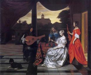 | Keywords: Pieter de Hooch - Musical Company on a Terrace with a view of the Amsterdam Town Hall.jpg Artwork creator Pieter de Hooch Title Musical Company on a Terrace with a View of the Amsterdam Town Hall Musicerend gezelschap op een terras ca 1667 248039 ca 1667 oil canvas cm 72 4 63 5 unknown Private collection P C Sutton Pieter de Hooch Oxford 1980 cat no 76 ; C Hofstede de Groot Beschreibendes und Kritisches Verzeichnis der Werke der Hervorragendsten Hollandischen Maler des XVII Jahrhunderts vol I Paris 1907 cat no 136 object history credit line https //rkd nl/explore/images/248039 Other versions PD-old-100 Genre paintings by Pieter de Hooch 1667 paintings Royal Palace of Amsterdam in art |