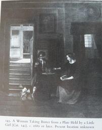 | Keywords: Pieter de Hooch - A Woman Taking Butter from a Plate Held by a Little Girl.jpg Artwork creator Pieter de Hooch Title A Woman Taking Butter from a Plate Held by a Little Girl ca 1680 “1684 oil canvas cm 93 82 unknown Private collection P C Sutton Pieter de Hooch Oxford 1980 cat no 142 ; C Hofstede de Groot Beschreibendes und Kritisches Verzeichnis der Werke der Hervorragendsten Hollandischen Maler des XVII Jahrhunderts vol I Paris 1907 cat no 65 object history credit line Own Pieter de Hooch Complete Edition by Peter C Sutton Phaidon Press Oxford 1980 ISBN 0714818283 Other versions PD-old-100 Genre paintings by Pieter de Hooch 1680s paintings |