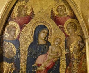 | Keywords: Pietro Lorenzetti - Virgin and Child with Saints and Angels - Walters 37731 - Detail B.jpg This magnificent enthroned Virgin and Child with four saints and two angels originally formed the center of a folding triptych a three-part painting The delicate punch-work in the haloes costumes and borders is typical of Sienese panel painting and are effects derived from metalwork Pietro Lorenzetti excelled at investing his sacred pictures with human qualities such as the Christ Child's playful interaction with the bishop-saint on his right The twisting pose of the Christ Child and the forward-leaning postures of the angels behind the throne are the invention of this remarkable painter and introduce a powerful sense of three-dimensional space into the scene The varied burnishing and polishing techniques cause the gold background to react differently to light creating a sense of depth and movement and evoking the preciousness of shimmering metal For more information on this piece please see Zeri catalogue number 23 pp 39-41 ca 1340 1345 Medieval tempera and gold leaf on panel Panel H excluding added triangular wood at apex 15 1/16 x W 9 13/16 x D 3/8 in 38 3 x 25 x 1 cm ; Painted surface cm 36 5 21 5 accession number 37 731 6422 Don Marcello Massarenti Collection Rome date and mode of acquisition unknown 1881 catalogue no 16 1897 catalogue no 21 as school of Giotto Henry Walters city Baltimore Walters Art Museum Henry Walters Acquired by Henry Walters with the Massarenti Collection 1902 place of origin Siena Italy Walters Art Museum license 2D Medieval art in the Walters Art Museum Pietro Lorenzetti Paintings in the Walters Art Museum Madonna and Child |