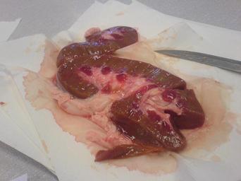 Keywords: Pig-kidney.JPG A pig kidney cut up displaying its intestants Photographed by Thor-Rune Hansen 2006-03-02 own assumed ThorRune~commonswiki Pig anatomy