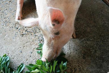 Keywords: pig pink happy fat hungry leaves fodder feeding eating pig head domestic animal hog farm