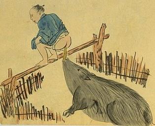 Keywords: Pig toilet1.jpg en pig toilet in Ryukyu 南島 話 名越左源太 1820-1881 date PD-old Defecation in art Toilet cartoons Ryukyu Kingdom Pigs in art