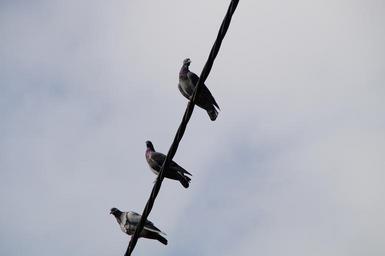 Keywords: pigeons power line sit gather birds electricity lines sky high above top