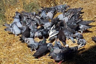 Keywords: pigeons swarm eating feather plumage birds spring dress poultry