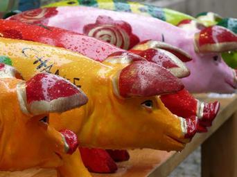 Keywords: pigs pig figurines figures colorful gaudy funny pig's ear